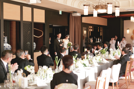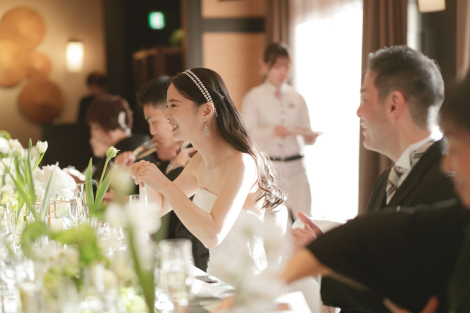 晩さん会スタイルでも円卓を並べたレイアウトなど、おふたりのご希望に合わせて多彩なアレンジが可能です。